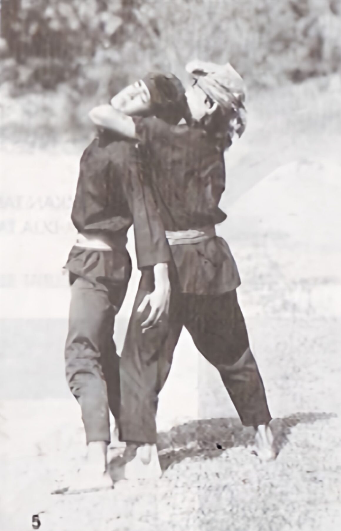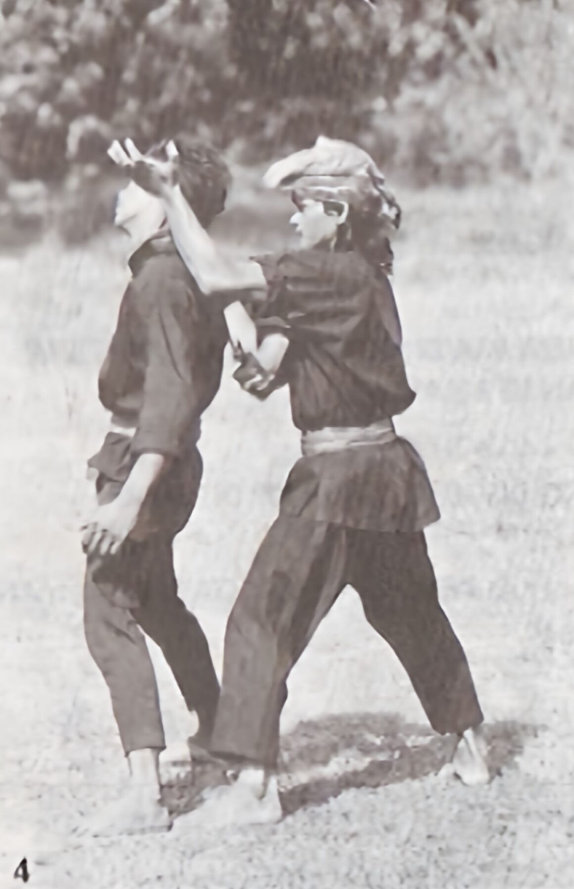 Dostaň se za něj a levou rukou jej udeř do krku.